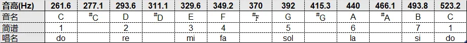 以国际标准音440Hz为准,小字一组的C到其下一个八度的C,基本音高与音名对应关系如下